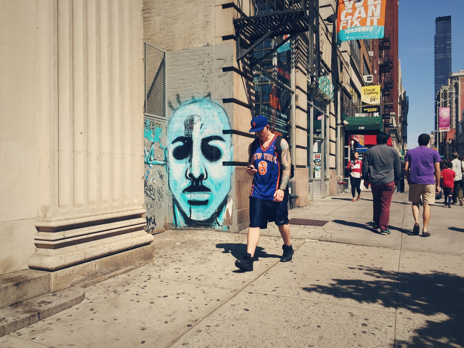 Oblivious passers-by walk past an icy blue head painted on a brick wall of a building on 23rd Street at the Flatiron District in NYC.