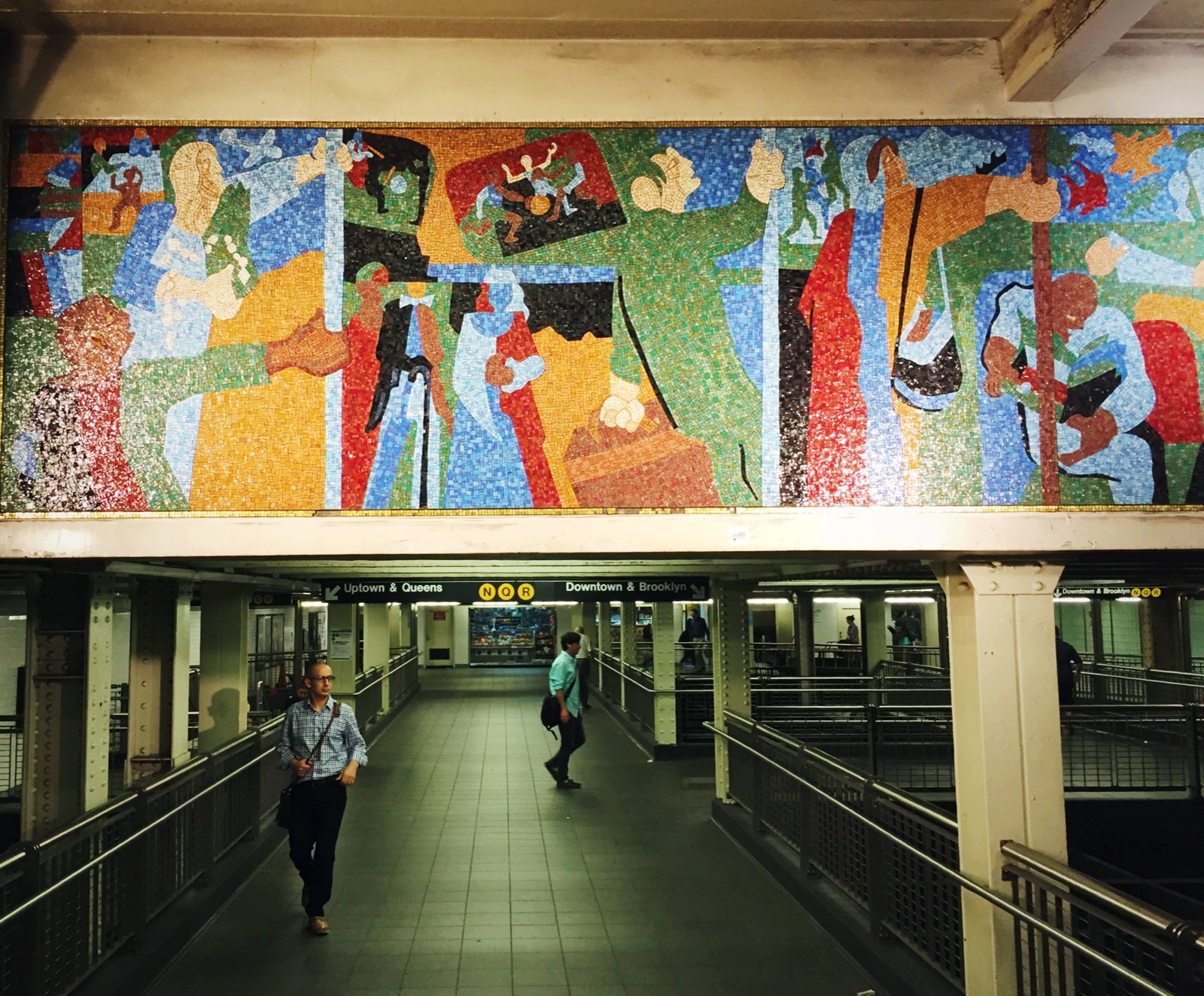 An artistic interpretation of a subway car’s interior is shown across the wall of an upper beam inside the Times Square station passageway in New York City.