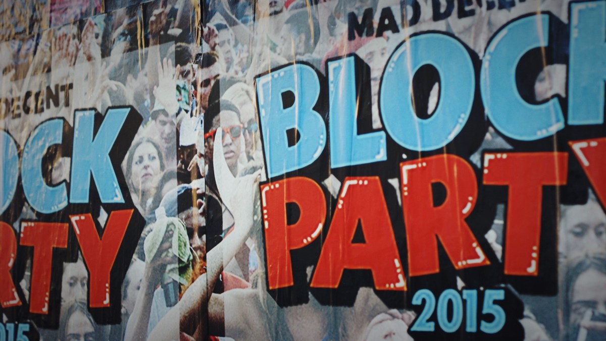A random party poster in downtown LA is seen on a temporary wall of a building construction site.