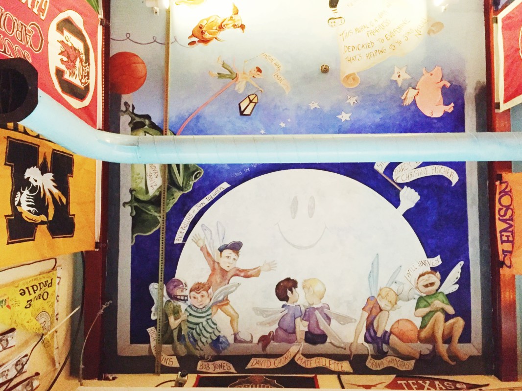 A ceiling at a bar in DC features some quirky and playful images of sprites. Can you spot the flying pig?