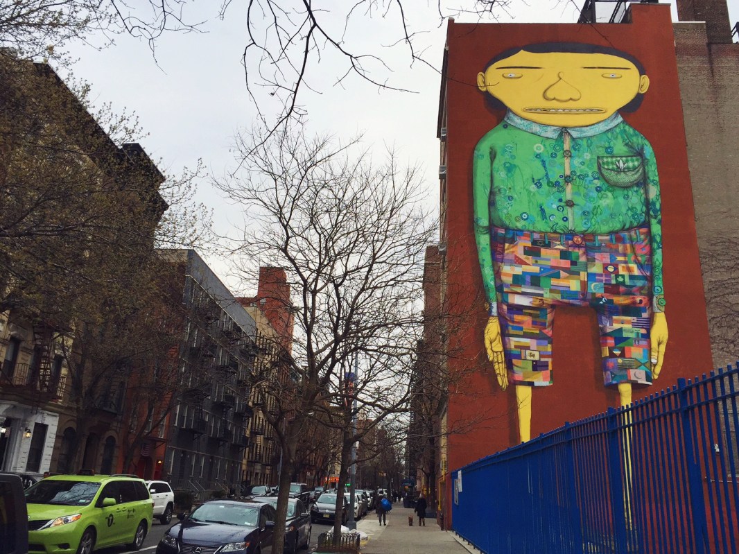 An artist drew an image of a big child on a wall of brick next to a school playground in the Chelsea neighborhood of Manhattan.